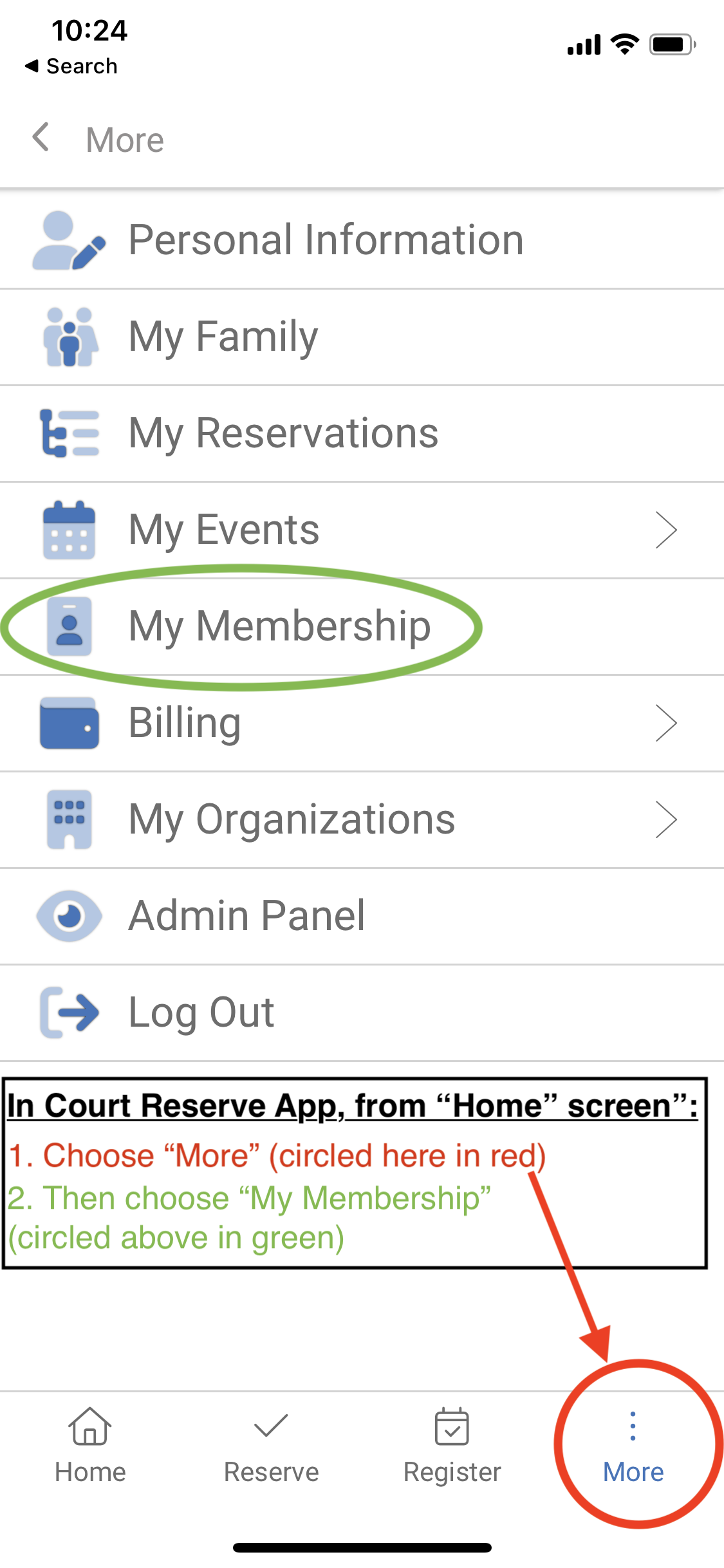Note that you can find the same information on Court Reserve website by clicking on your name in the top right corner, then My Membership.